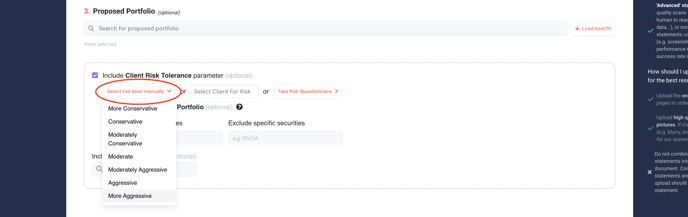- This tool will also work to find the best fit within the risk level. Within the Portfolio Intelligence tab, select the check box next to "Include Client Risk Tolerance parameter".