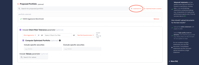 - Then click on the "Load best fit" button within the "3. Proposed Portfolio" section. This will find the best the closest match portfolio of the portfolios that the user designated as a model grouping.