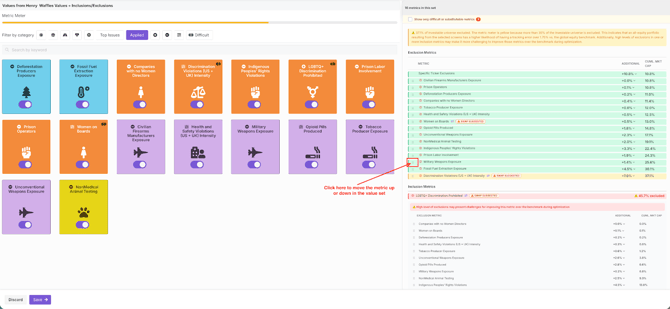 - The default prioritization is to list metrics in descending order, from the least amount of market cap excluded (green) to the most amount of market cap excluded (red).