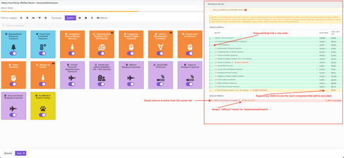 - The meter is now interactive, so you can see the % of the universe that is being eliminated for each metric as well as cumulatively, as you select additional metrics for a value set.