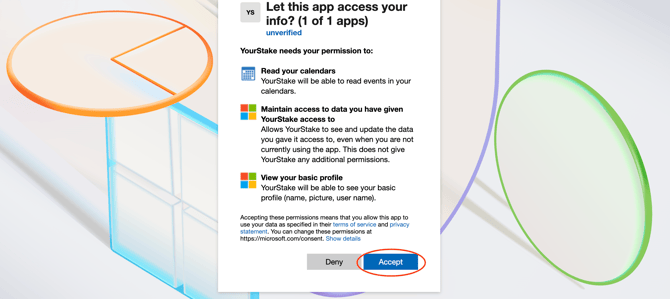 - On the permissions screen, verify that YourStake is only requesting calendar access. Click "Accept" to grant the necessary permissions.