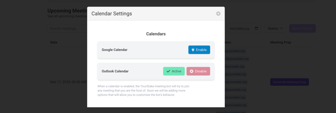 - When the status shows as "Active," the YourStake meeting bot will automatically attempt to join any meeting where the user is the host, unless changed within Meeting Preferences.